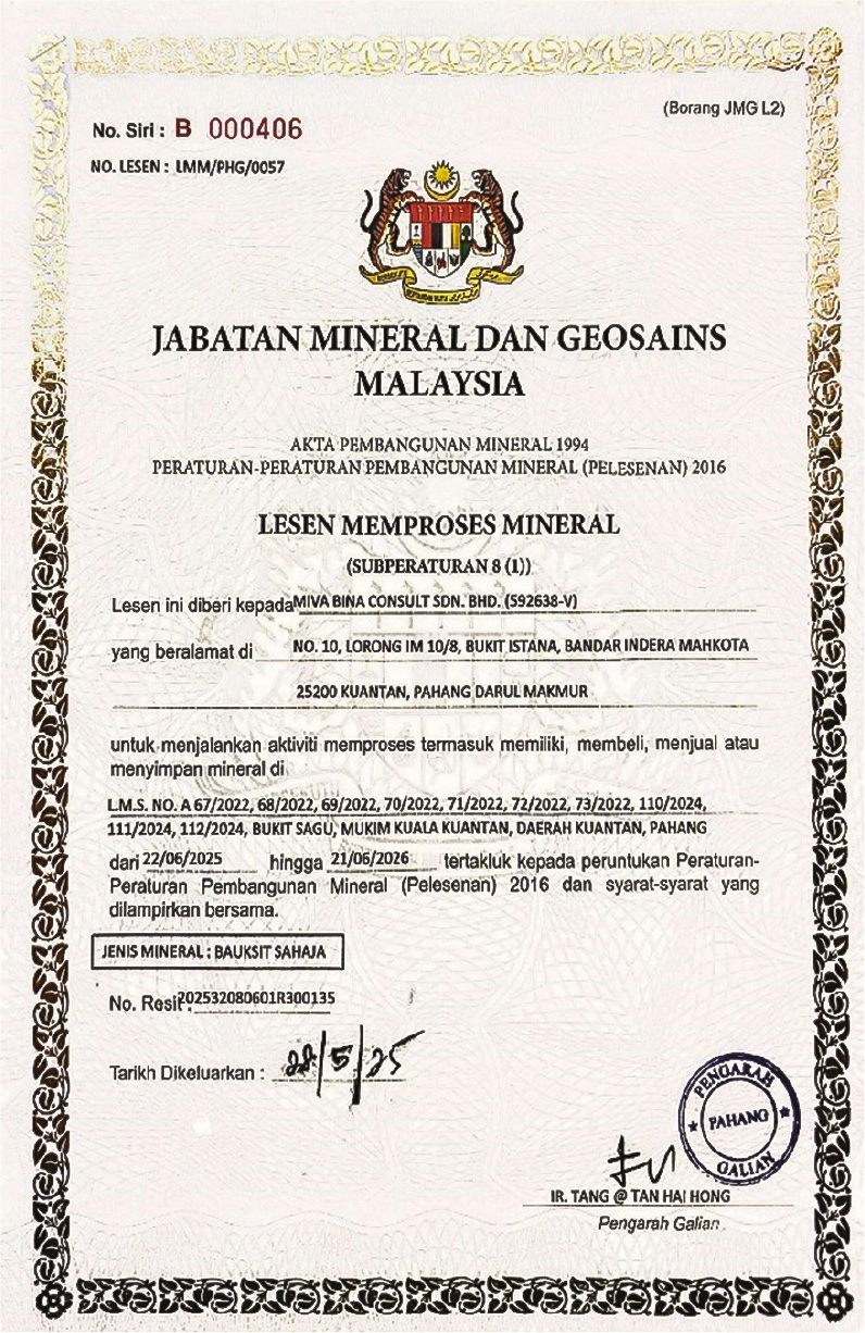 Registered holder of the Mineral Processing License (LMM) issued by JMG Pahang under the Mineral Development Act 1994. Licensed to process, own, purchase, sell and store minerals. Over 14 years of industry experience in mining, processing and material management with modern, environmentally responsible machinery.